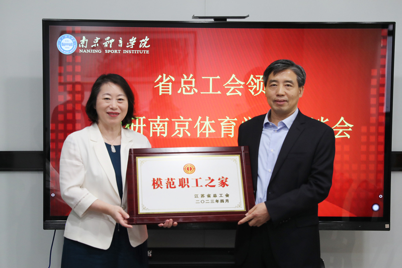 省总工会副主席张迎春向校党委书记刘红明颁发“江苏省模范职工之家”奖牌
