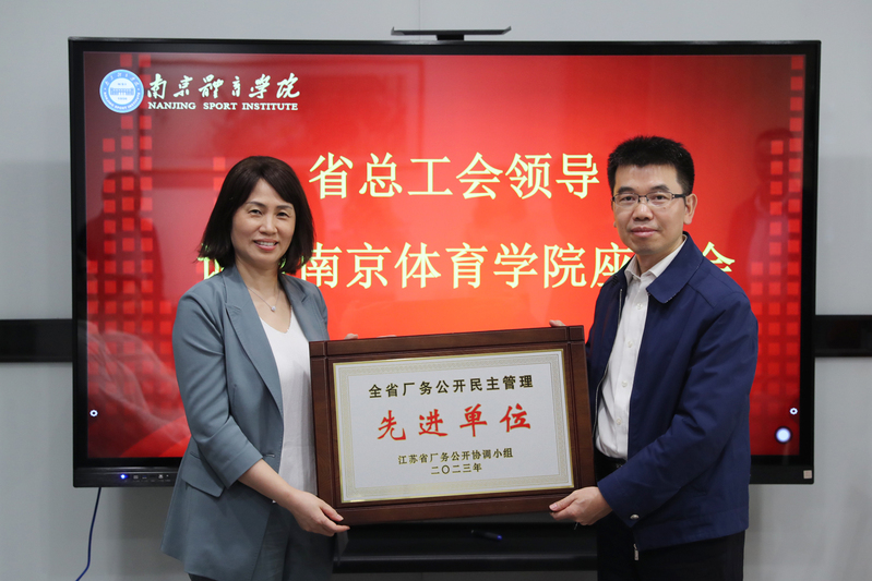 省纪委监委派驻省总工会机关纪检监察组组长潘林珍向校党委副书记兰亚明颁发“全省厂务公开民主管理先进单位”奖牌