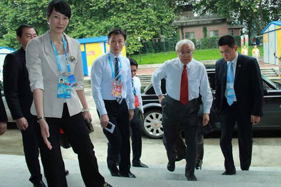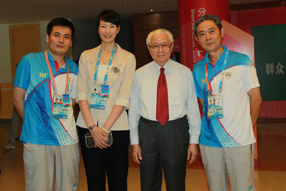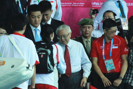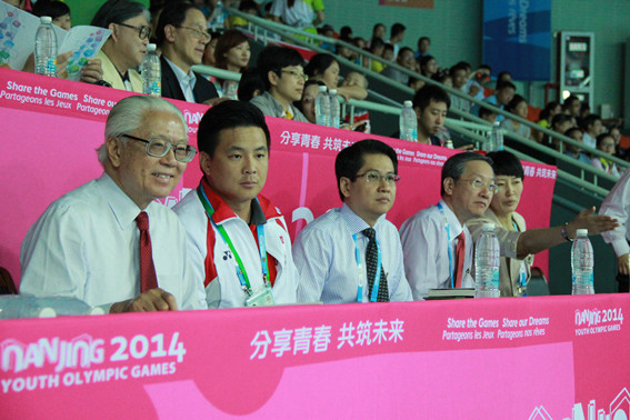 2014年8月17日中午,新加坡总统陈庆炎来我院观看青奥会羽毛球男单小组赛,并亲切慰问了参赛的新加坡青年运动员和教练员,我院院领导肖爱华陪同。本届青奥会,新加坡共派出18名男女选手参加跳水、乒乓、羽毛球等八个项目的竞赛,其中有两名运动员参加羽毛球比赛。