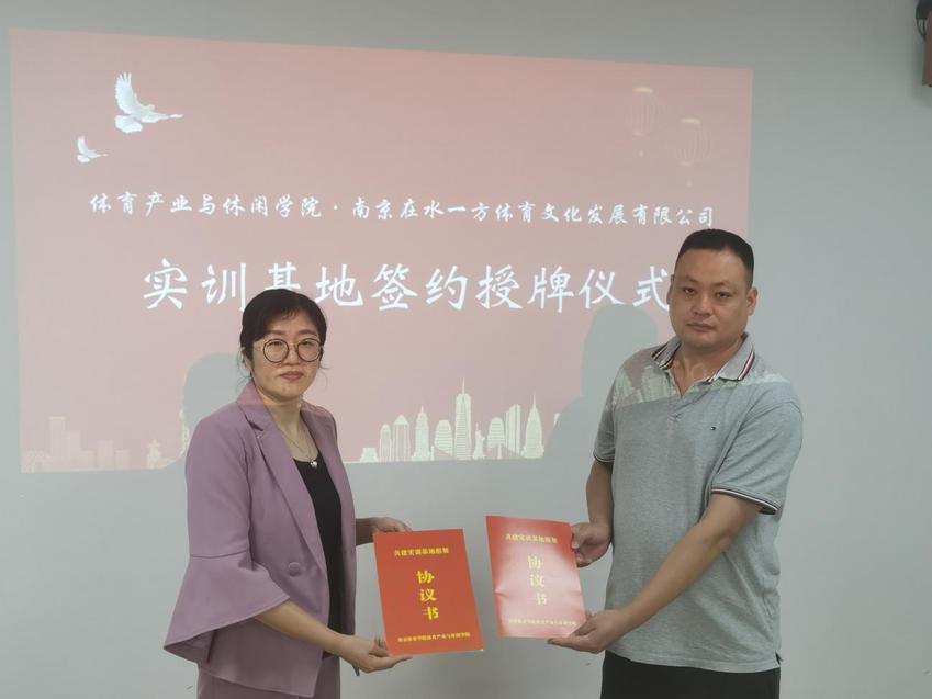 柏景岚和沈廷峰共同签署共建实训基地框架协议书,在与会人员的共同见证下,柏景岚为南京在水一方体育文化发展有限公司授牌。