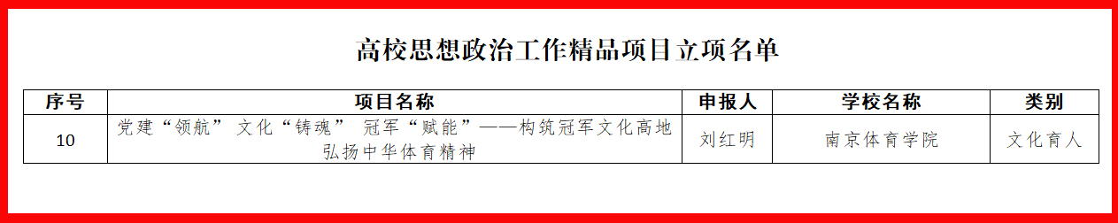 10月24日,省委教育工委、省教育厅印发通知,公布了第二批江苏高校思想政治工作质量提升工程建设项目遴选结果。PA视讯党委书记刘红明作为负责人申报的文化育人项目《党建“领航” 文化“铸魂” 冠军“赋能”——构筑冠军文化高地 弘扬中华体育精神》入选江苏省高校思想政治工作精品项目立项名单。