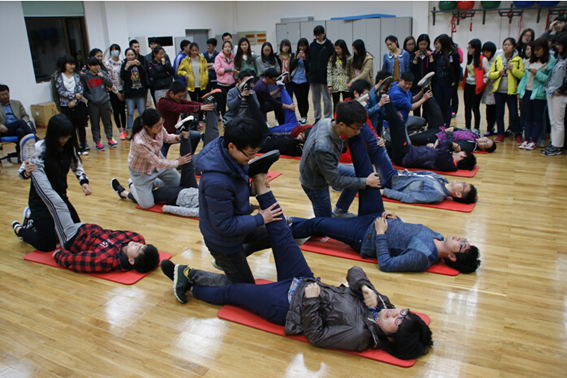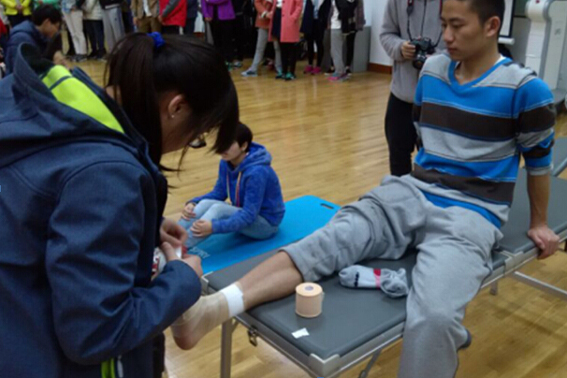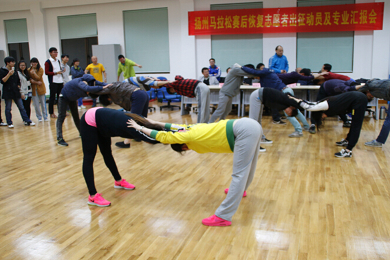 汇报会首先由运动健康系主任孙飙汇报了有关联络、培训、制作宣传资料等筹备工作,随后志愿者进行了现场模拟演练,展示了牵拉、按摩、冰敷、贴扎等多种赛后恢复的专业技能,还展示了特为本次扬马赛后恢复编排的、富有特色的拉伸操。最后,陈书记发表了热情洋溢的讲话,充分肯定了运动健康科学系师生的志愿行动,勉励大家严格要求,精益求精,为学院做出新的贡献。
