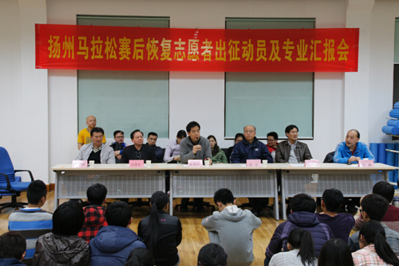 4月14日晚,在距“第十届扬州鉴真国际半程马拉松赛”还剩4天的时候,运动健康科学系170余名师生,在院省级重点实验室——“运动训练与康复实验室”二楼,召开“扬马”赛后恢复服务志愿者出征动员及专业汇报会。院党委书记陈国祥、副书记、副院长汤岩、副院长史国生,以及学工处处长陆玉林、教务处处长严海平等出席。