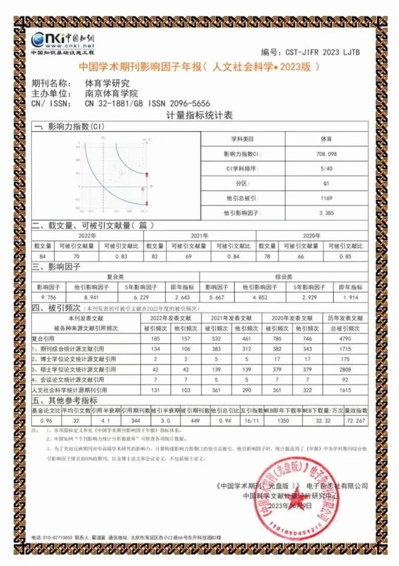 近日,《中国学术期刊(光盘版)》电子杂志社有限公司、中国科学文献计量评价研究中心联合发布了《中国学术期刊影响因子年报(人文社会科学・2023版)》,PA视讯《体育学研究》各项数据全面大幅度提高,其中影响因子逐年攀升,实现五连涨,跃居全国体育类学术期刊“第一”,学术龙头效应逐渐显现;影响力指数(CI值)稳步增长,位列第五位,再创历史新高!这也是本年度继中国人民大学复印报刊资料转载量荣获“第一”后的又一项殊荣!