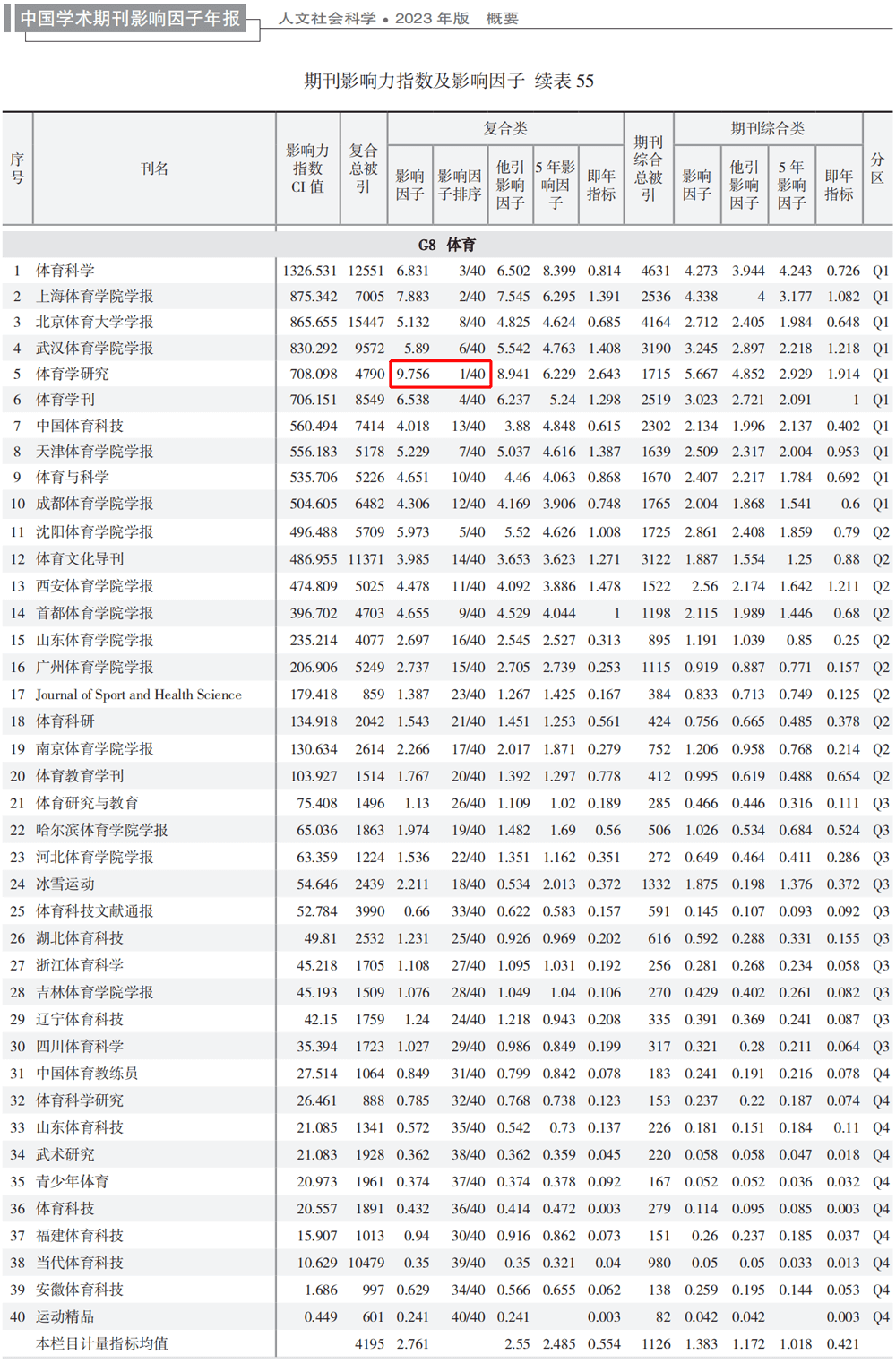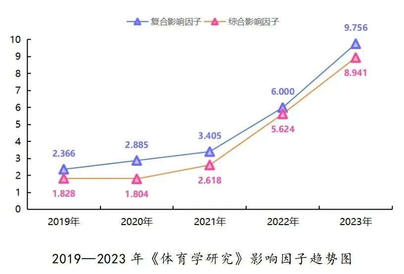 《中国学术期刊影响因子年报》中的期刊各类影响因子和影响力指数(CI值),是度量期刊学术创新影响力和整体学术水平的主要指标,也是我国各类核心期刊评定相关指标的重要来源之一。《体育学研究》的复合影响因子为9.756,相较2022版的6增幅达62.6%,相较2019版的2.366,增幅达4倍之多;综合影响因子为8.941,相较2022版的5.624,增幅达58.9%,相较2019版的1.828,增幅更是达近5倍;影响力指数(CI值)为708.098,相较2022版的612.418增幅达15.6%,相较2020版的495.859,增幅达42.8%,其排名也由原来的第8位提升到了现在的第5位,等等。各项数据的大幅度提升是期刊快速发展的最好印证,也是近年来学校给予大力支持和编辑部辛勤付出的良好回馈,更是各位编委、作者、审稿专家和广大读者与期刊的双向奔赴、齐心协力、共创佳绩的美好结果!感恩有您,一路相伴!