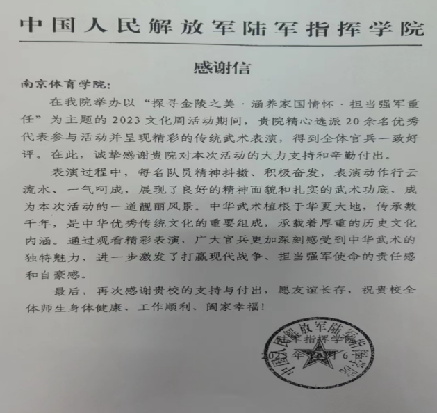 接到邀请,学院高度重视,由武术系骨干教师冷传奇组织节目编排,武术与民族传统体育专业16名大三学生和2名大一学生参与展演。11月2日,武术与艺术学院辅导员陆丹带领队伍前往中国人民解放军陆军指挥学院。下午三点和五点共两场表演,分别有大约300名中国人民解放军陆军指挥学院附属幼儿园师生及150名来自52个国家的外军学员来到现场。武术与艺术学院的学生以饱满的精神状态和精湛的功夫技艺,带来节目《武韵东方》,展示中华武术文化的独特魅力,赢得阵阵掌声和喝彩。11月6日,陆军指挥学院来函致谢,表示精彩的表演进一步激发了广大官兵打赢现代战争、担当强军使命的责任感和自豪感。
