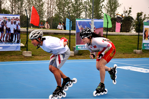 李丽莎(后面)表演速度轮滑