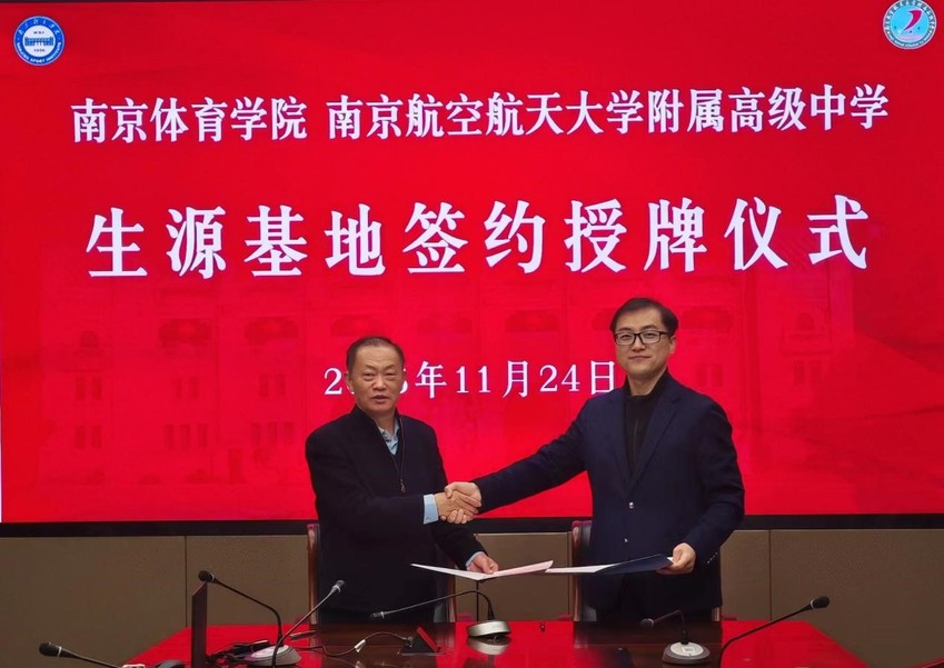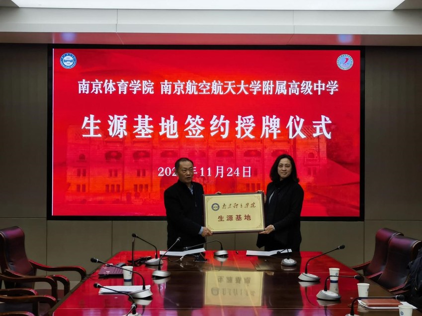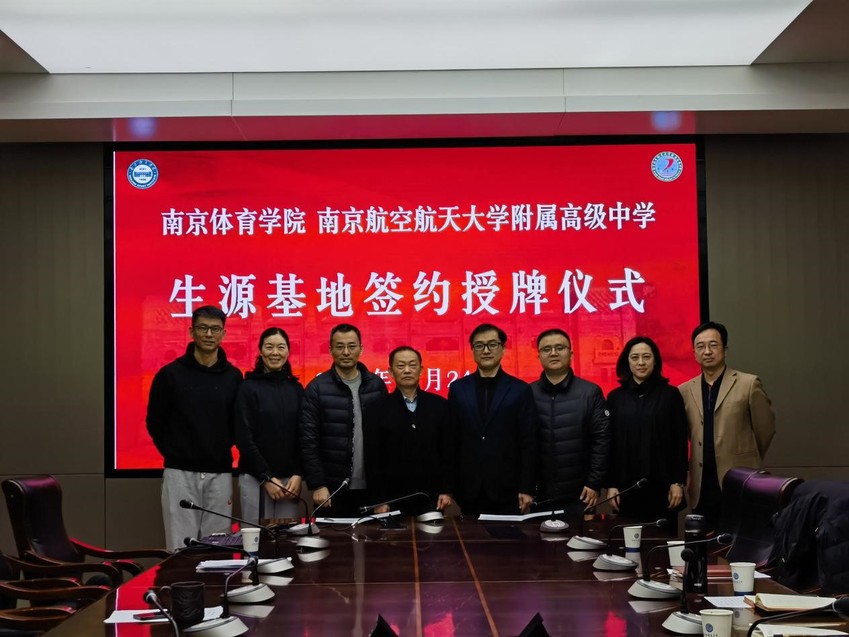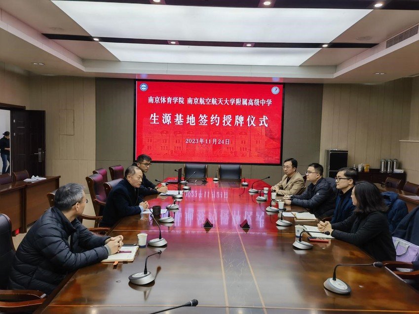 为进一步构建与中学合作共赢的交流平台,选拔、输送和共同培养优秀学生,11月24日,体育教育与人文学院党总支书记卢奎、党总支副书记喻菊、学工处招生办公室副主任万冲凯、通识教育部主任蒋丰一行4人赴南京航空航天大学附属高级中学签约“生源基地建设合作协议”并举行授牌仪式。南京航空航天大学附属高级中学书记蒋国和、德育处主任沙国梁、体育组老师(南京市高中体育学科带头人)王达梅参加了活动。活动由南京航空航天大学附属高级中学体育教研组组长王若穷主持。