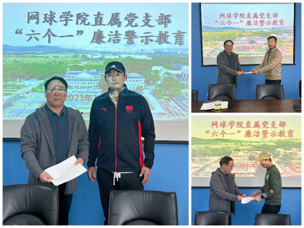 根据校纪委《关于开展“六个一”廉洁警示教育活动的通知》文件要求,按照学校统一部署,网球学院于2023年11月25日在澳网厅开展了廉洁警示教育活动,学院领导班子、管理干部、教练员参加了会议。网球学院直属党支部书记唐存楼和院长陆玉林对全体党员干部和全体教练员进行一次集体廉政谈话。