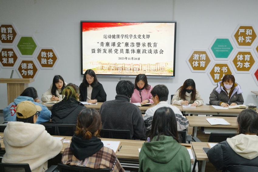 11月28日,运动健康学院学生党支部开展“青廉课堂”——廉洁警示教育暨新发展党员集体廉政谈话会活动。会议由学院党总支副书记阚妮妮主持。