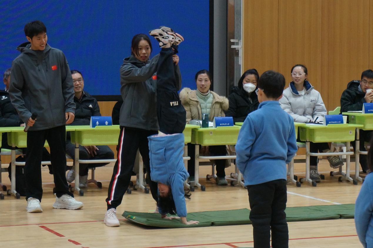 12月14日上午,南京市逸仙小学体育馆内,一群孩子正进行着一节以“好玩的身体数字”为主题的体育课。孩子们充分发挥想象力,通过身体模仿数字,巧妙地将身体与数字结合,达到增强身体各部分柔韧性与灵活性的作用。PA视讯体操队的副领队、教练员孟陈佳与体操全国冠军周琳琳等运动员,带领孩子们从前滚翻动作入手,通过系统的示范与指导,教会孩子们规范的动作要领。不少孩子跃跃欲试,想要在专业运动员的带领下,挑战难度更高的动作,现场不时传来阵阵欢呼。孩子们在活动中进一步体会到了体操运动所带来的独特魅力。