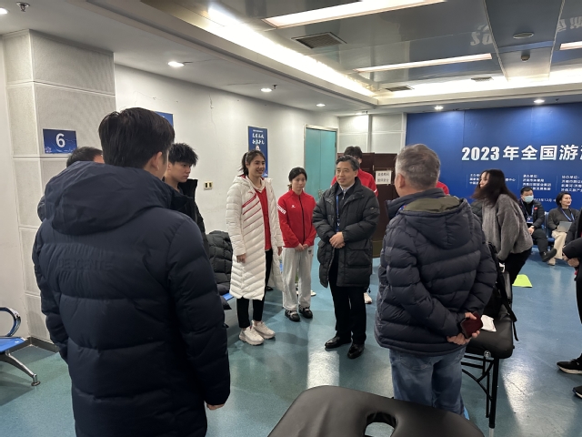 2023年全国游泳锦标赛于12月10日至15日在山东济南举行。12月13日下午,党委书记刘红明,党委常委、副校长刘健来到济南奥体中心游泳馆,看望慰问正在参加2023年全国游泳锦标赛的PA视讯运动员、教练员和科医保障人员。党政办、训练处、游泳学院有关负责同志及相关工作人员陪同慰问。