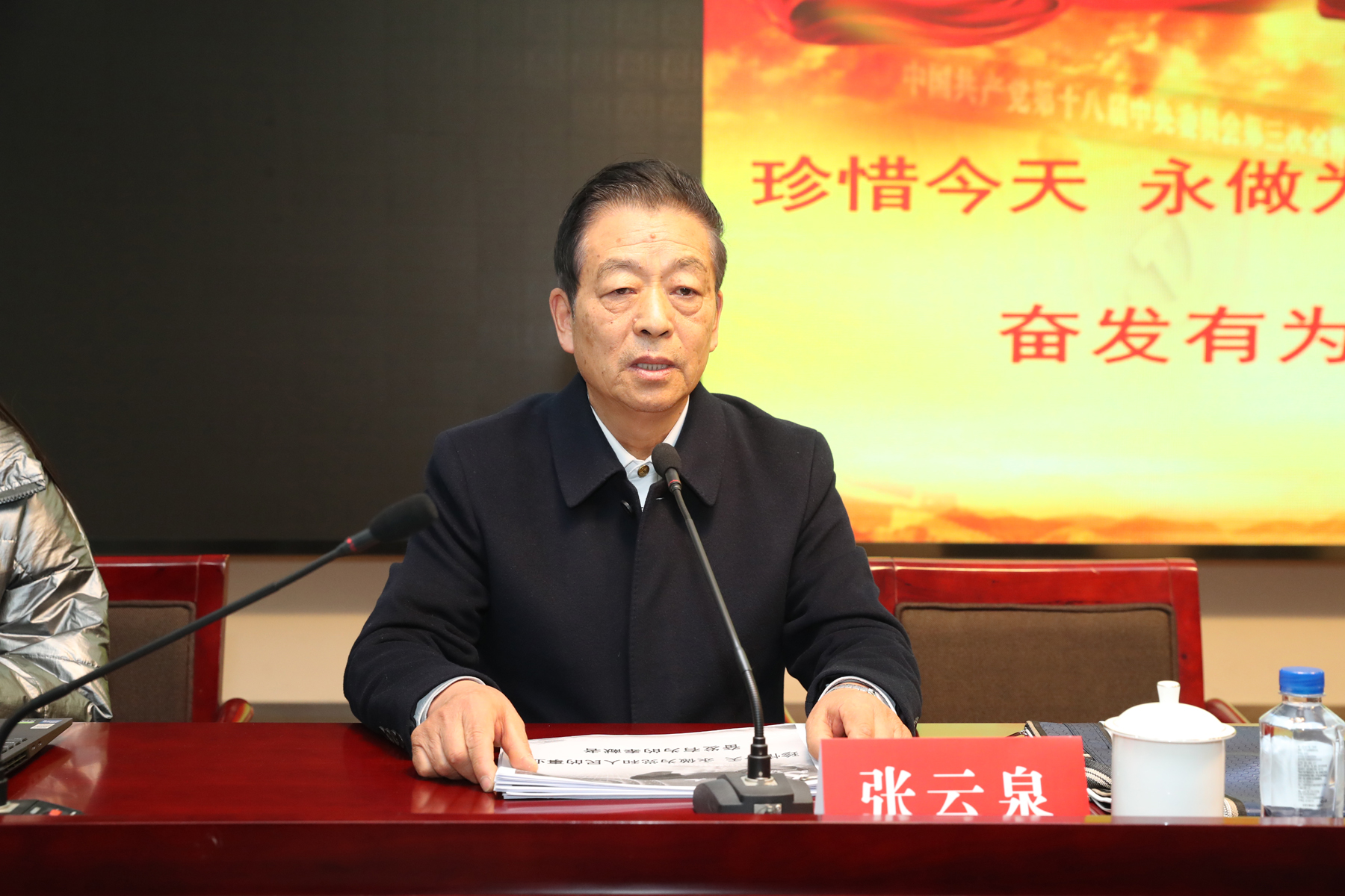 张云泉在会上作题为《珍惜今天 永做为党和人民的事业奋发有为的奉献者》的报告。报告分为三个部分:一、始终坚定信仰、爱党爱国,永葆干事创业的激情和动力;二、始终做到在党忧党、迎难而上,为巩固党的执政基础而奋斗;三、始终坚持为爱国主义教育服务,协助学校探索提升思政课质量。在报告中,张云泉讲述了他从农村小伙到海军战士再到信访干部近50年的成长经历,介绍了他践行“把每项工作做到让党放心、让人民满意”的工作作风,生动地展现了一名共产党员的崇高理想、坚贞品格和担当精神。他结合自身成长经历,对爱国主义教育等进行了深入思考,并由此对高校思政课建设和辅导员队伍建设提出了极具启发意义的意见。整场报告理实结合、案例丰富、语言朴实、感情充沛,令人深受感染和震撼,引发与会人员强烈共鸣,激发了大家见贤思齐、奋力在建设高水平体育大学的新征程中立足岗位作贡献的豪情和斗志。