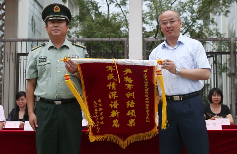 会上,院党委副书记、副院长汤岩代表学院向解放军理工大学工程学院学员大队赠送锦旗。锦旗上书有“严格军训结硕果、军民情深谱新篇”14个大字,表达了双方在以军训为纽带的互助合作中结下的深厚友谊和取得的丰硕成果。
