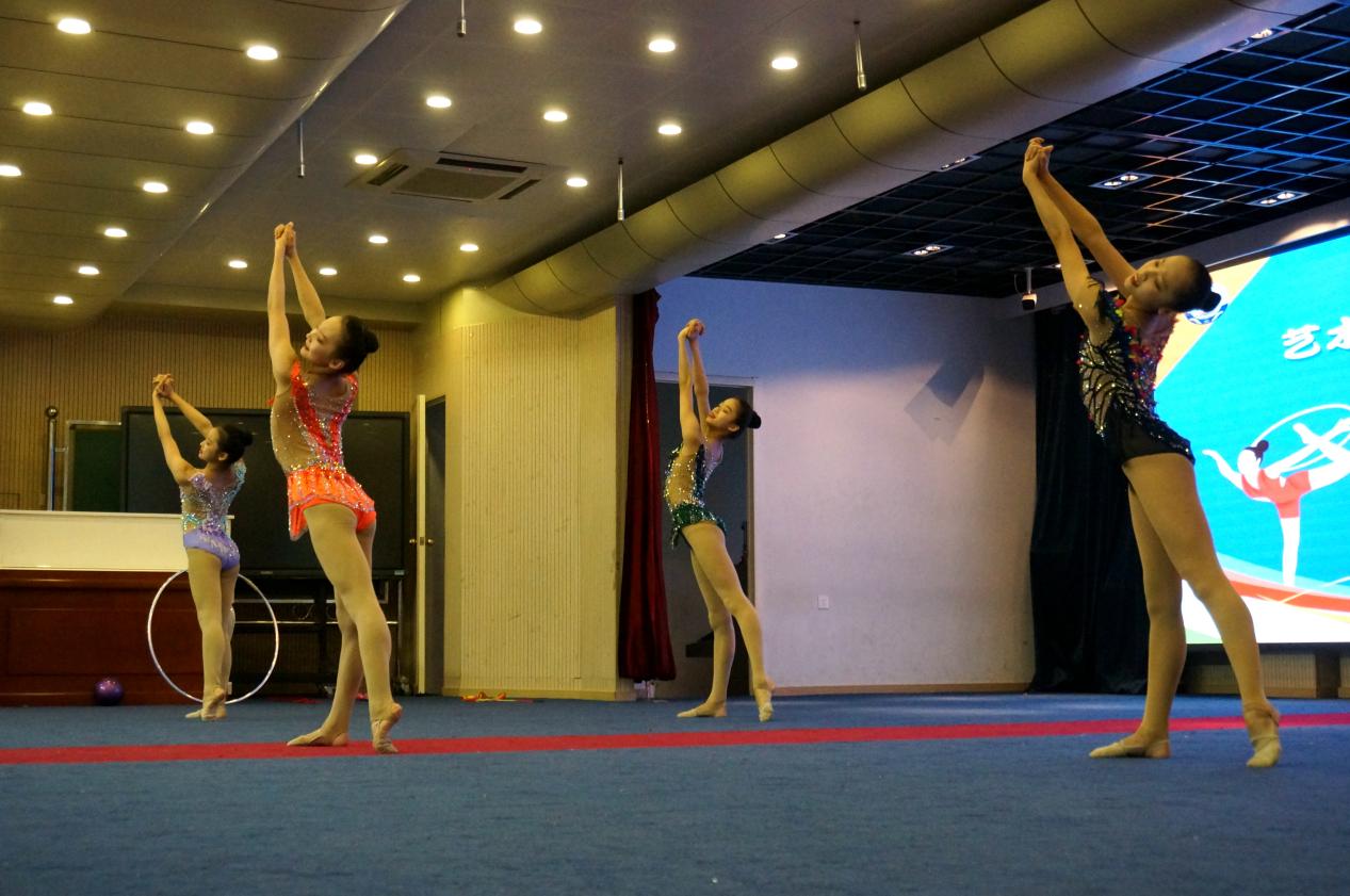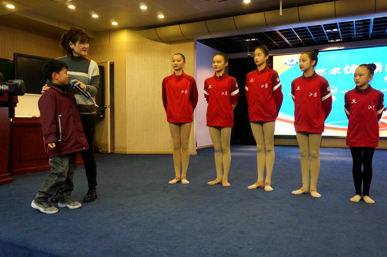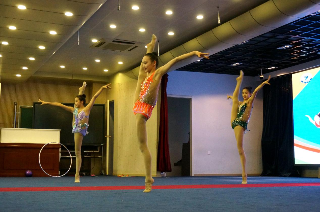 运动员们首先进行了徒手动作的展示,她们优雅的仪态,柔美的身姿令人眼前一亮。接下来绳、圈、球、棒、带的器械展示,自然、流畅、优美、富有节奏,更是让现场的孩子们发出阵阵喝彩。在随后进行的互动环节中,孩子们在艺术体操队的张宇燕教练的带领下,亲身体验艺术体操器械,了解了艺术体操的基本动作要领。