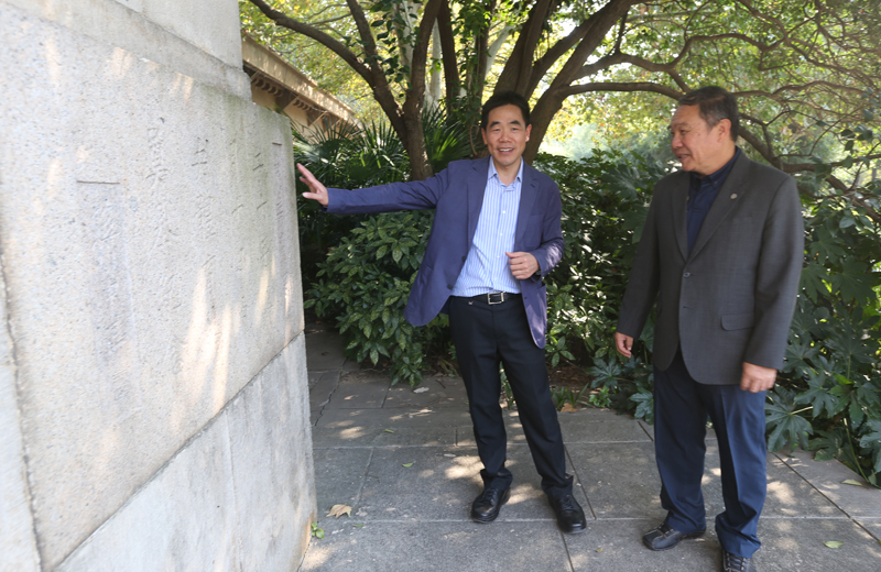 院党委书记、院长陈国祥为林华韦校长一行介绍中央体育场墙壁上的题词