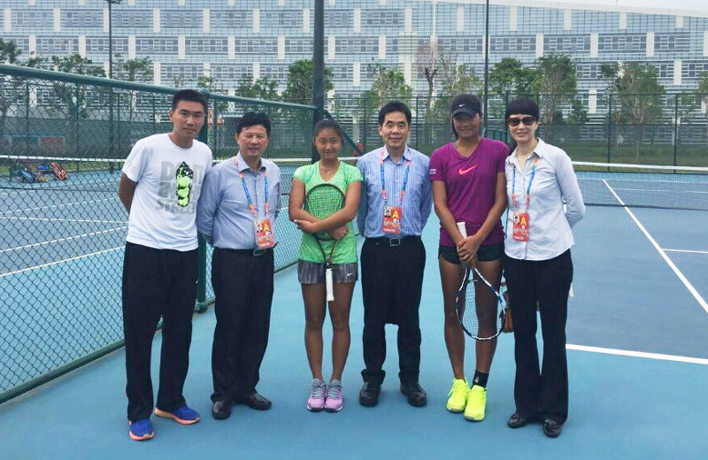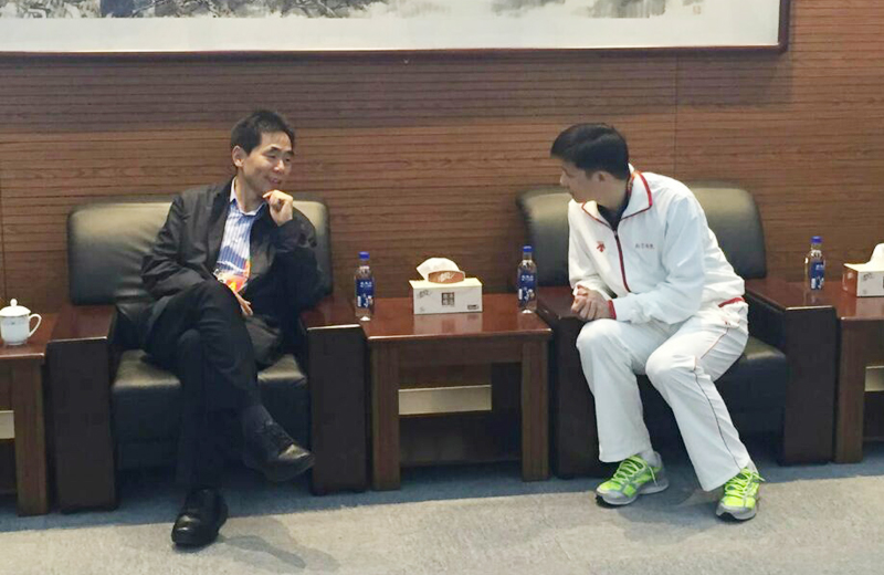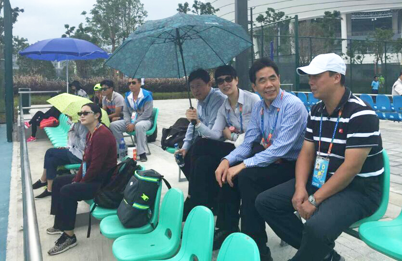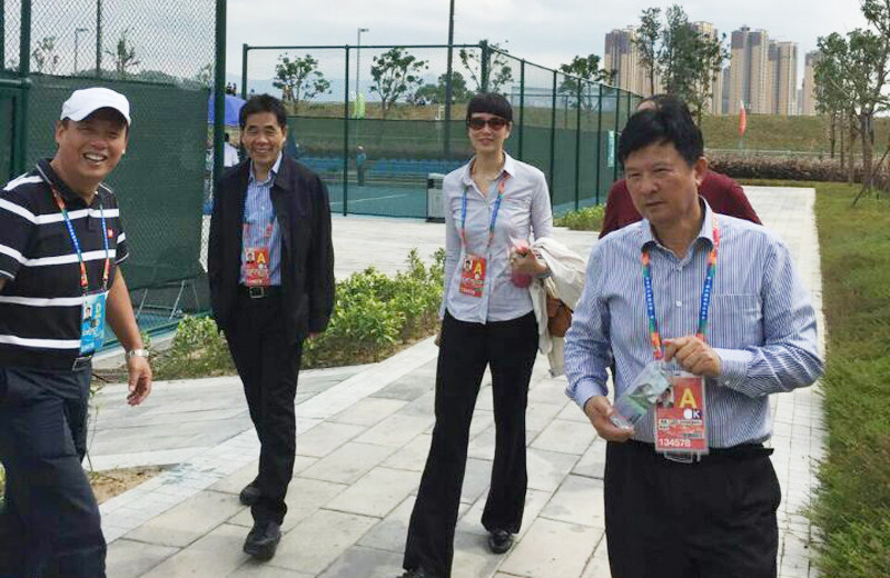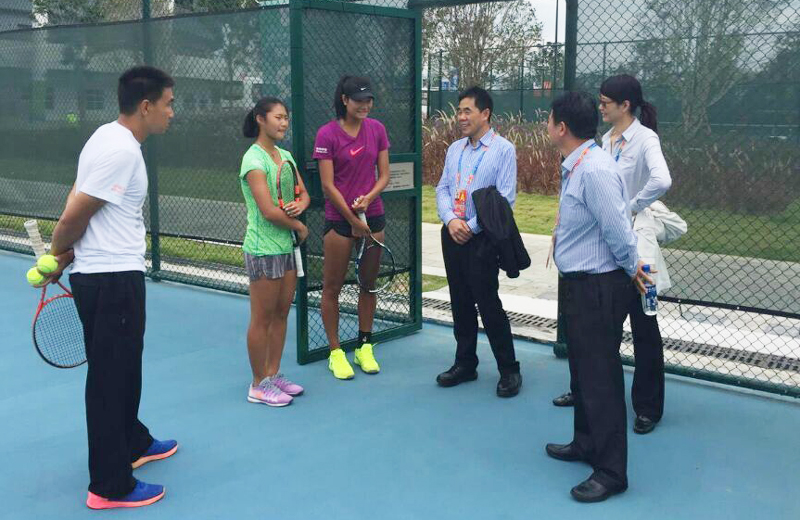 与征战赛场的管理人员、中国网球学院副院长张健亲切交流
