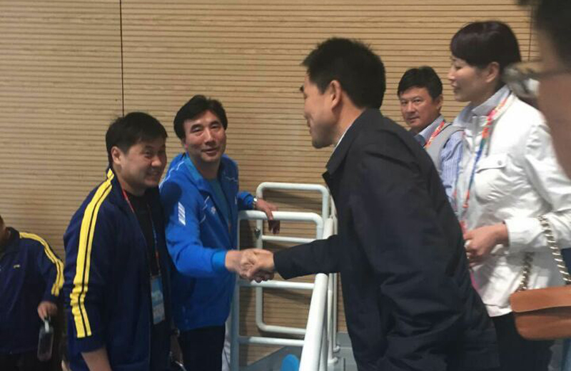 与教练员贾桂华亲切握手
