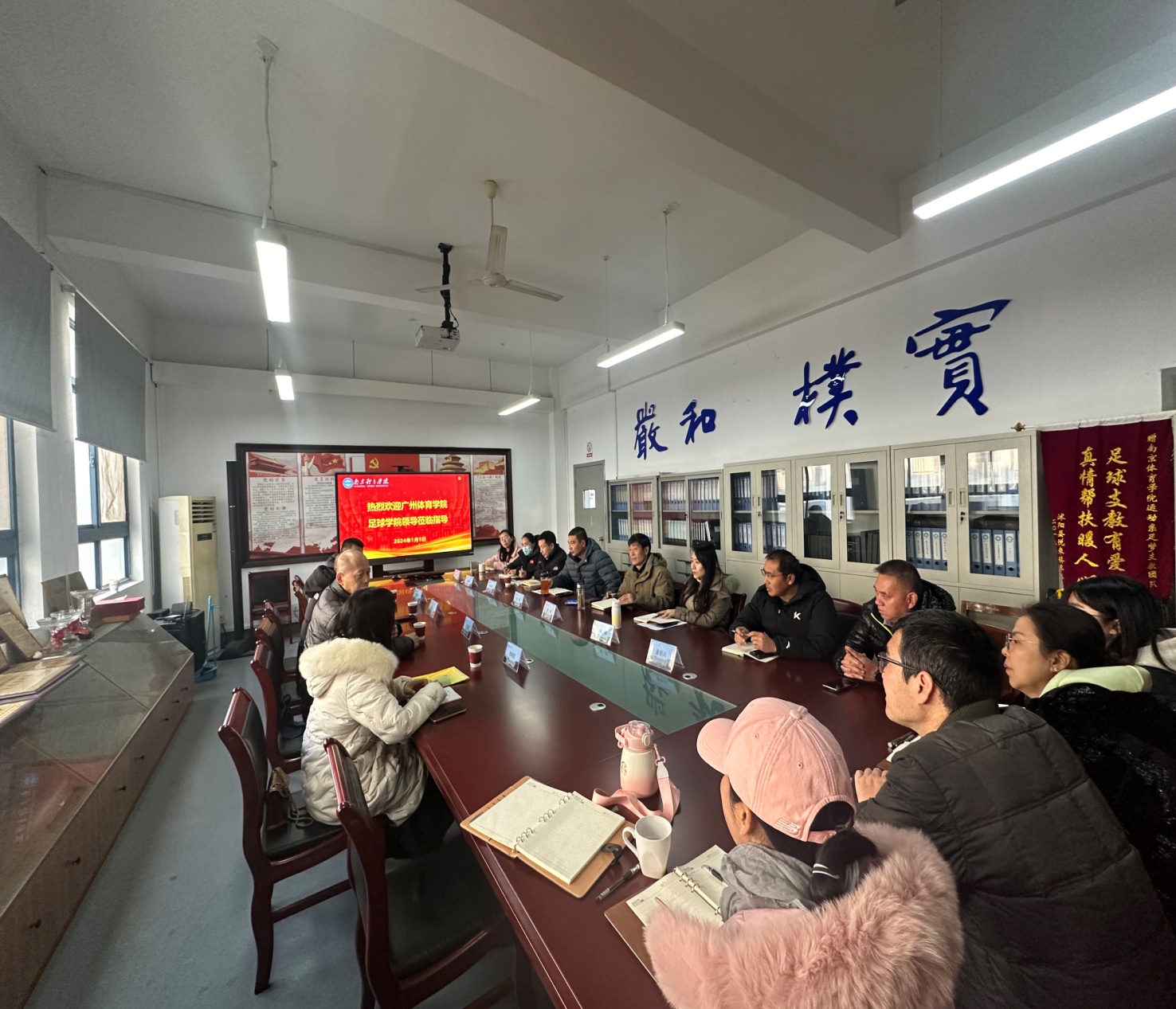 2024年1月5日上午,广州体育学院足球学院党总支书记钟卫健、党总支副书记周兴生、竞训教研室副主任吕康强、辅导员李晓聪一行来学院调研交流。学院领导赵琦、张明、杨蓉,办公室主任江秋寒,辅导员吴海艳、黄洪,体能支部书记胡海旭和足球支部书记侯学华及足球系副主任董新风和足球教师代表参与座谈。会议由学院院长赵琦主持。