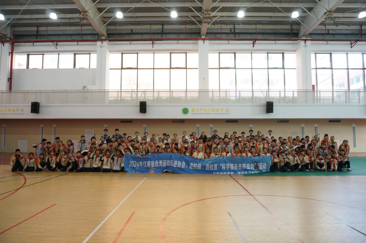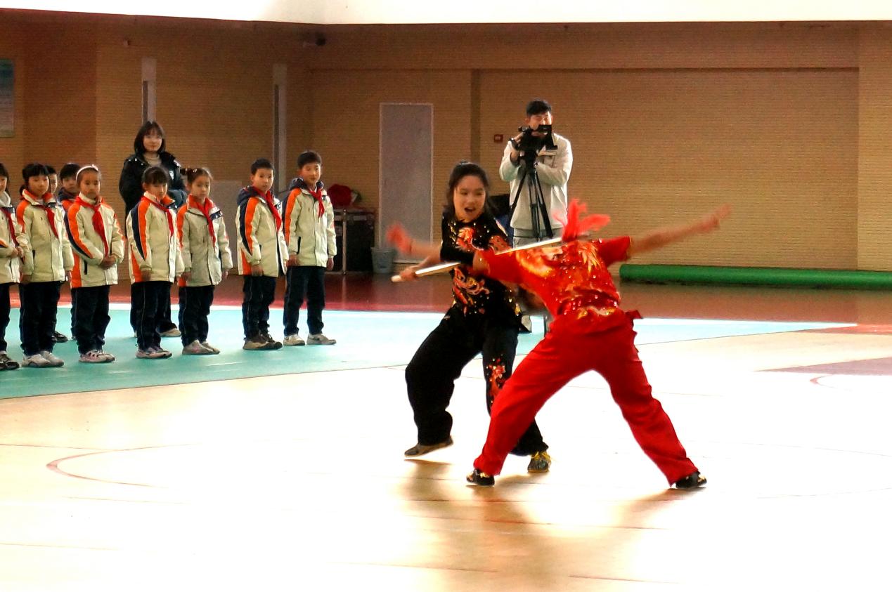 1月5日下午,省体育局训练中心江苏省武术队的运动员们来到了南京河西外国语学校小学部参加进校园活动。音乐响起,首先进行的是团体项目的展示,只见八名运动员精神饱满,健步上场,武术运动员特有的精气神便惊艳全场,随着音乐鼓点做着气势十足的翻腾动作,收获了小学生们的掌声和欢呼声。随后上场的队员,分别展示了太极拳、长拳、南拳、双刀、长枪等多个项目,队员们在场上精神昂扬,招式尽显活力。展示过后,队员们一字排开,和同学们面对面进行武术基本功教学,教学气氛活跃而热烈。