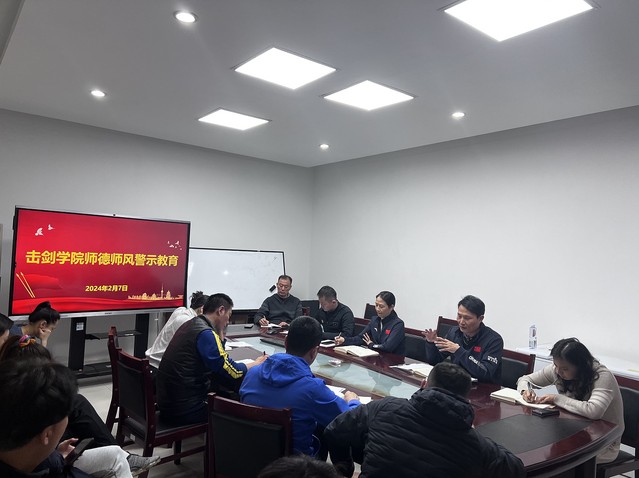 为进一步加强师德师风建设,强化全体教职工党风廉政责任意识,提高教练员的职业道德素养,规范训练行为,2月7日,击剑学院组织教练员开展师德师风和党风廉政警示教育大会。