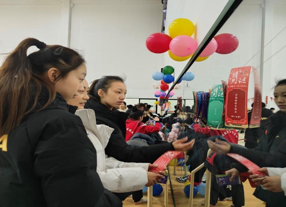 当天下午艺术体操馆内装扮一新,一个个大红灯笼高高挂起,一串串喜庆的装饰挂件,将节日的“仪式感”直接拉满,喜庆的氛围弥漫在场馆的每一个角落。活动现场人头攒动,热闹非凡。本次联欢会分为五个区域——“福字拓印”、“猜灯谜”、“套圈”、“新年好运滚滚来”和“趣味乒乓接力赛”。 广大运动员、教练员踊跃参加,每个项目前都排起了长队。大家兴高采烈地沉浸在欢乐热闹的游戏中,游戏高潮一浪接着一浪,现场不时传来欢笑声、喝彩声。活动现场还为运动员们准备了丰富实用的小奖品,孩子们手握奖品券至兑奖处领取,纷纷乘兴而去、满载而归。