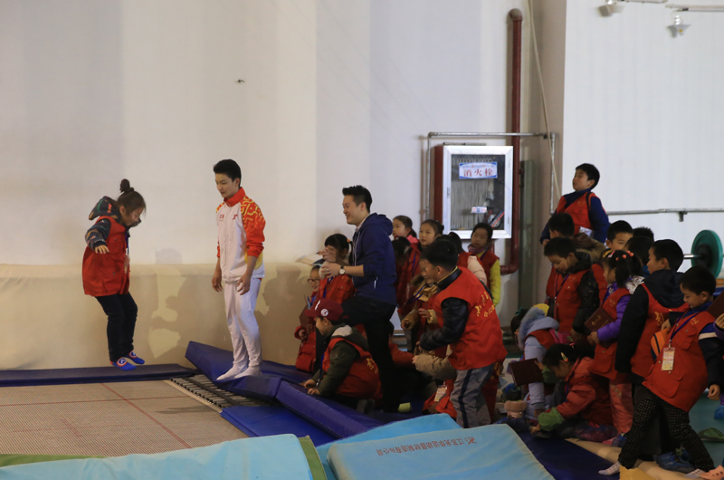 奥运冠军陆春龙为小记者讲解蹦床知识