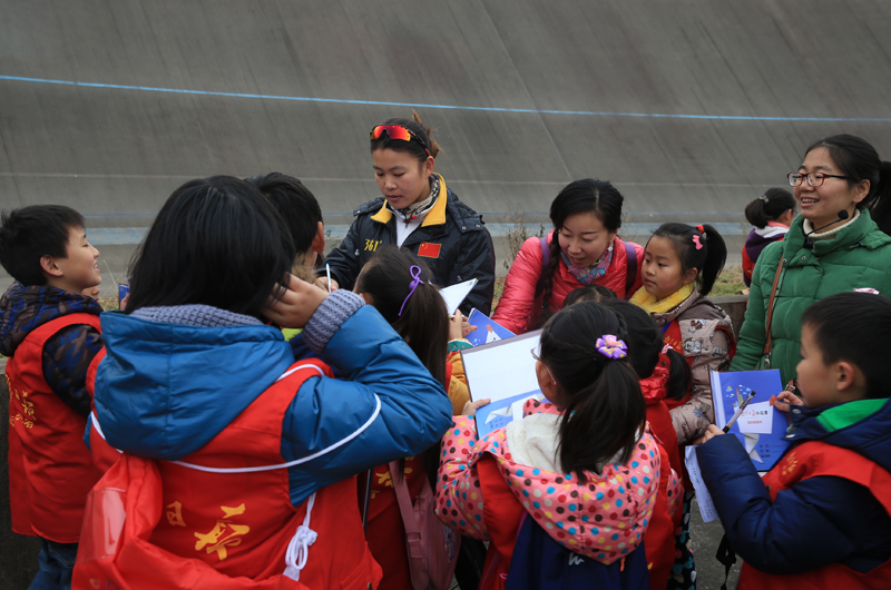 第六届全国城市运动会场地自行车项目女子记分赛金牌得主吴超梅受到小记者围捧
