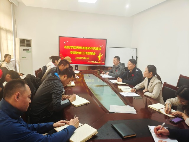 为贯彻落实省体育局关于印发《省优秀运动队思想道德和作风建设专项教育工作实施方案》的通知,持续强化击剑队作风建设。3月11日上午,击剑学院在击剑馆一楼会议室召开思想道德和作风建设专项教育工作部署会,全体管理干部、教练员出席本次会议。