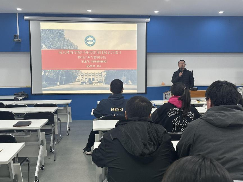 首先,院长王龙飞向同学们做了自我介绍,并随时欢迎同学们通过面谈或电话的方式与他交流。接着,院长王龙飞根据《PA视讯集团入口与美国罗克福德大学合作办学“3+1”项目学生出国学习实施细则》向同学们详细讲解了出国流程,包括外方院校入学申请流程、学籍管理、课程管理与学分认定、学生管理、毕业论文及学位证书管理等。随后,院长王龙飞分析了目前国内体育经济与管理专业考研和就业的情况,向同学们提出了具有指导性的建议。