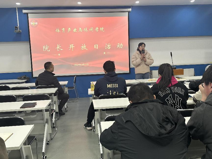 3月12日体育产业与休闲学院在中美多功能厅举办了体育经济与管理(中外合作项目)专业院长开放日活动。本期活动主要为2022级、2023级有意向第四年去美国学习的同学进行指导。体育产业与休闲学院院长王龙飞、副院长柏景岚、中外合作项目专职秘书杨林、王婷老师参加了活动,活动由副院长柏景岚主持。