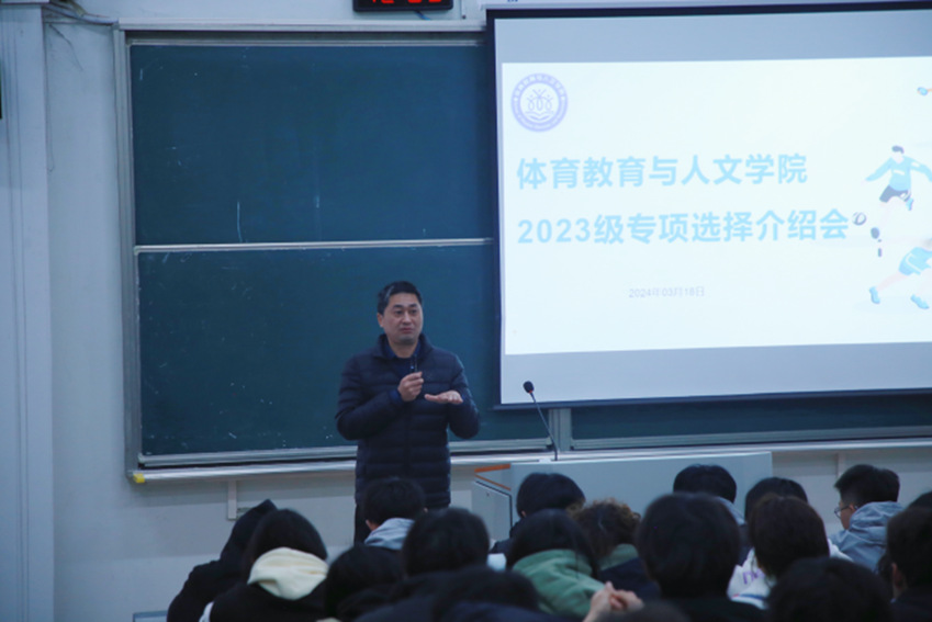 为扎实推进新一轮体育教育专业学生专项选择准备工作,确保学生专项选择流程更加高效。3月18日中午,体育教育与人文学院体育教育系在教学楼阶一召开2023级专项选择介绍会。体育教育系主任霍军,2023级体育教育专业班主任、辅导员及2023级全体学生参加会议。会议由丁雅凡主持。