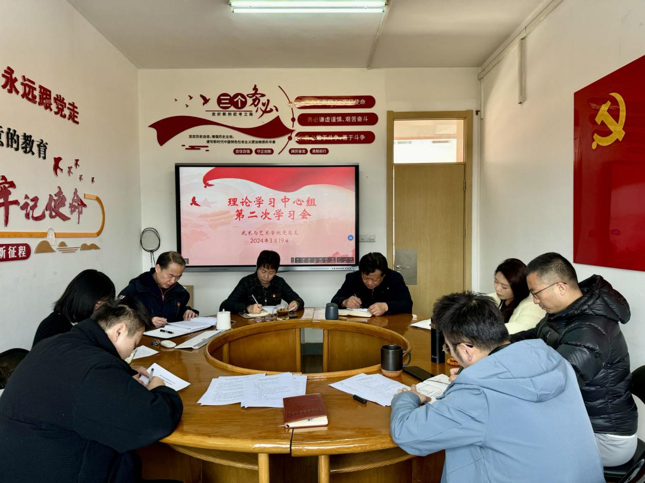 3月19日下午,武术与艺术学院党总支书记叶瑛主持召开学院理论学习中心组学习会。会议集中观看了全国“两会”闭幕式视频,深入学习了《党史学习教育工作条例》《中共中央办公厅关于巩固拓展学习贯彻习近平新时代中国特色社会主义思想主题教育成果的意见》以及习近平在参加江苏代表团审议时强调因地制宜发展新质生产力重要讲话精神,传达学习了校党委理论学习中心组2024年第一次学习(扩大)会议精神,并就学习贯彻作出部署。学院理论学习中心组全体成员参加会议。