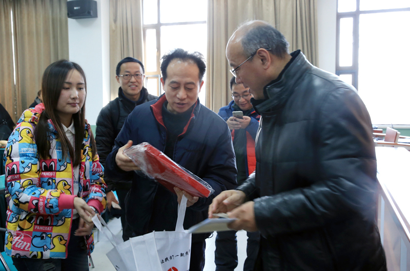 江苏广电总台教育频道记者向汤岩副院长赠送他们的节目光盘
