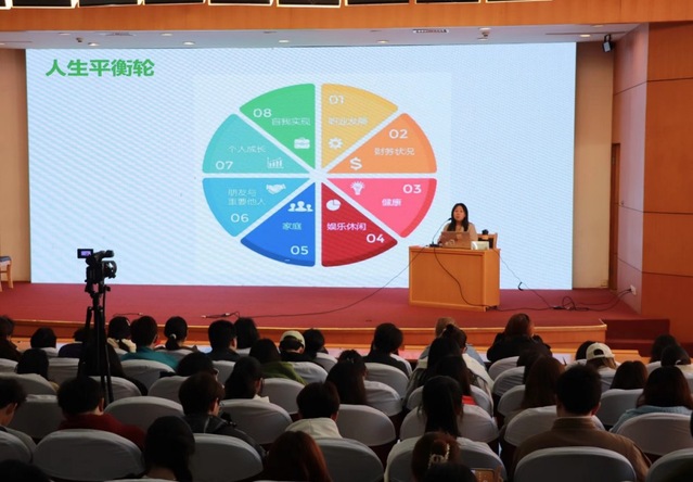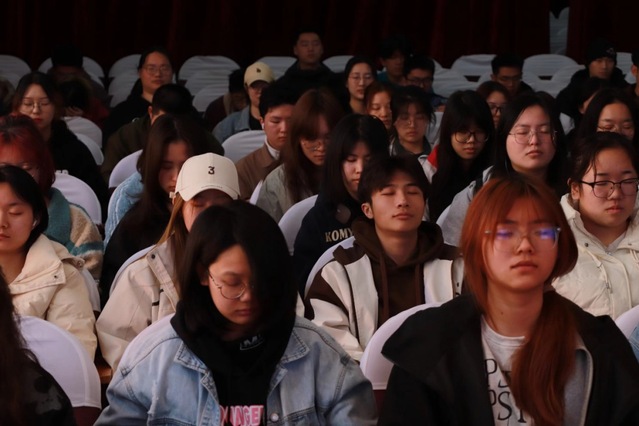 为了帮助同学们更好地管理自己的情绪,侍老师提出了几点具体建议。她建议同学们从职业发展、财务状况、健康、娱乐休闲、家庭、朋友与重要他人、个人成长、自我实现等八个方面,构筑个人的人生平衡轮,以实现生活的全面平衡。同时,她还鼓励同学们保持昂首挺胸的姿态,主动调整自己的情绪,给自己留下足够的空间来应对生活中的挑战。尤其是生活方面,侍老师着重强调了保持环境整洁的重要性,认为一个整洁的宿舍和自身形象不仅能够提升个人的生活品质,还有助于改善心理状态。最后,侍老师还教授了同学们一些简单的正念方法,并带领全体同学进行了一次短暂的正念练习。在轻松的氛围中,同学们闭上眼睛,跟随老师的引导,专注于呼吸和身体的感知,体验正念带来的平静与放松。这次练习不仅让同学们对正念有了更加直观的感受,也让他们深刻体会到了正念在调节心理状态方面的积极作用。