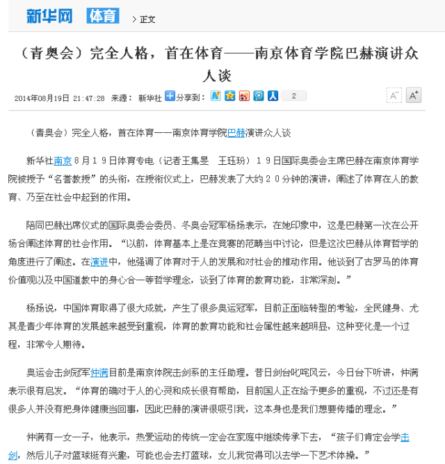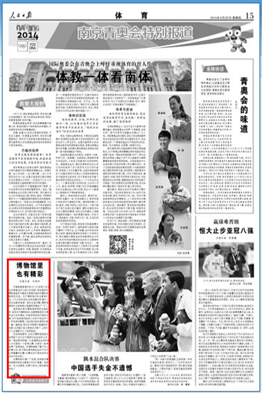 就在2014年南京青奥会期间,作为党中央机关报和中国第一大报,版面极度紧张的情况下,《人民日报》毅然以《国际奥委会呼吁重视体育的育人作用 体教一体看南体》为题免费对我院进行了大篇幅报道。报道由《人民日报》体育部主任、高级编辑李中文和记者马剑执笔。整篇报道长达2400余字,以南京青奥会为切入点,通过“巴赫的选择”、“南体的实践”、“继承与传承”三个部分介绍我院体教一体的教育理念、高校办运动队的教学模式和取得的成效。文章认为,时至今日,我院体教一体发展路径所蕴含的独特价值,非但未随时空变迁而流失,反倒愈加凸显,其发展、推广值得期待。