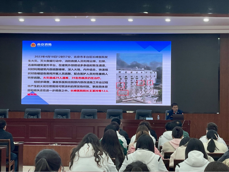 校园属于人员密集型场所,尤其是宿舍、食堂等场所,一旦发生火灾,后果不堪设想。讲座上,梅指导例举了山西吕梁市一企业职工食堂、北京丰台区长峰医院、南京金陵小区一住宅、南京长白街龙虾店、江宁一商铺以及部分高校发生的火灾案例,分析这些火灾发生的原因,讲解发生火灾应该怎么办、如何识别并消除火灾及正确疏散逃生等方法,提醒大家要充分认识到消防安全的重要性,牢记“躲火避烟”的逃生准则,养成“用火不离人”的生活习惯。他告诫全体师生消防安全无小事,应自觉增强消防意识,掌握基本消防器材的使用,关注防火门状态,注意电动自行车使用安全,杜绝使用违章电器、违禁物品和三无产品。