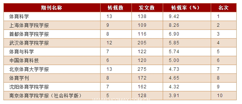在目前160余种体育类期刊中,2015年度被《复印报刊资料》全文转载的体育类期刊仅有23种,《PA视讯集团入口学报·社会科学版》2015年度共全文转载5篇,在全国体育类期刊中转载数排名第10位,转载率排名第10位,综合指数排名第10位,进入该资料库重要文献转载来源期刊。较之以往,我刊每年仅被转载1-2篇,总量上取得了较大突破,综合指数排名提升明显。