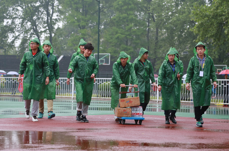 物资小分队走在湿漉漉的操场上