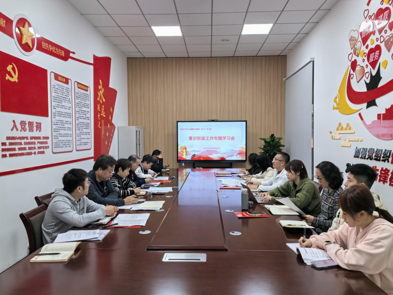 4月2日,武术与艺术学院党总支理论中心组(扩大)召开意识形态工作专题学习会。会议由学院党总支书记叶瑛主持,理论学习中心组全体成员、各党支部委员、系副主任参加会议。