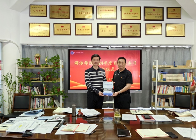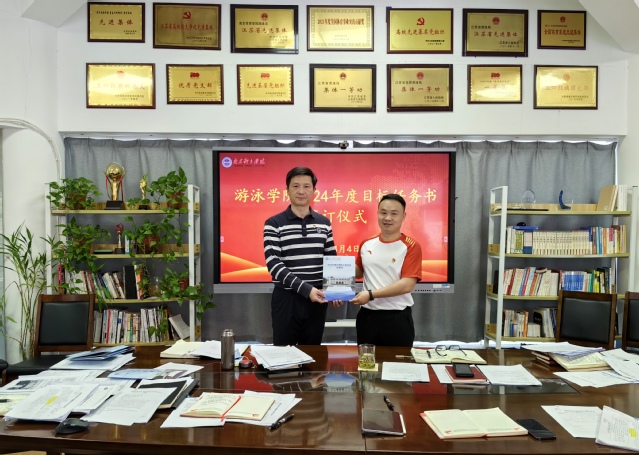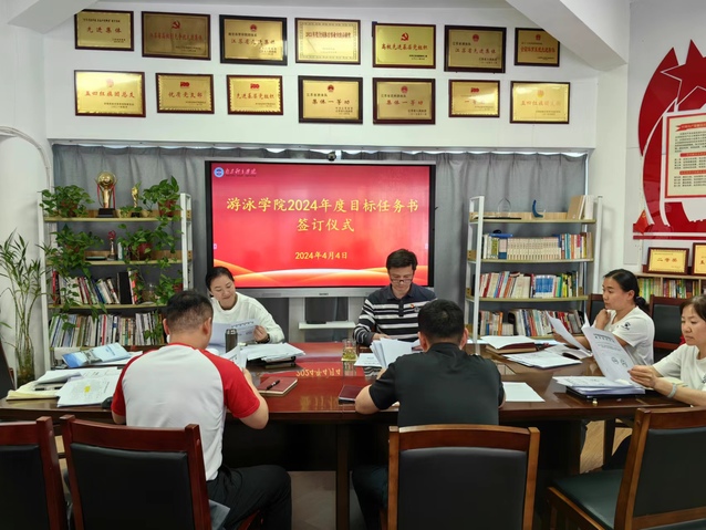 4月4日下午,游泳学院在跳水花游馆二楼会议室举行2024年度目标任务书签订仪式。会议由游泳学院院长王伟新主持,全体管理干部参加会议。