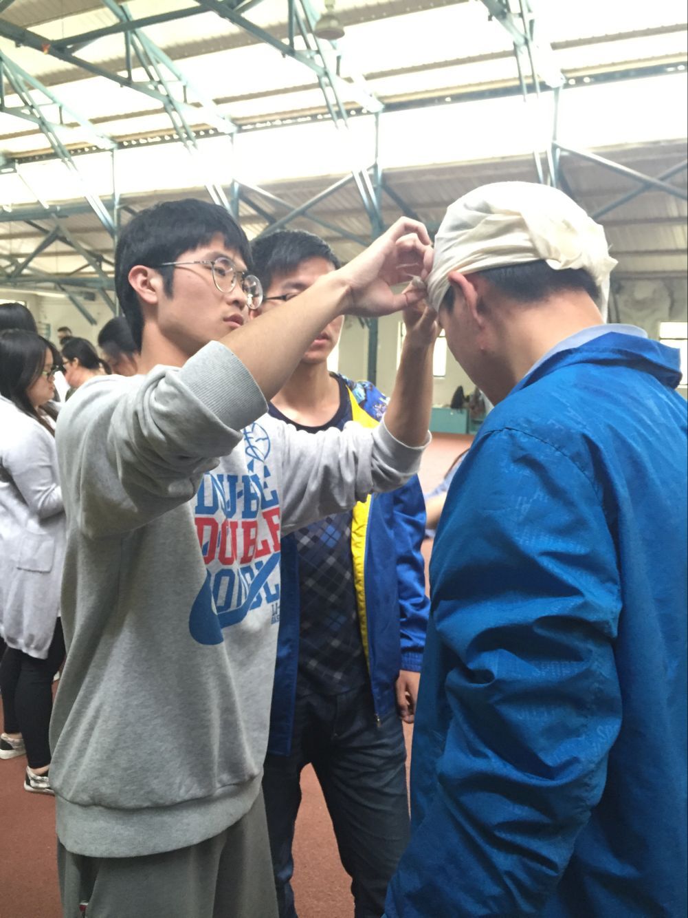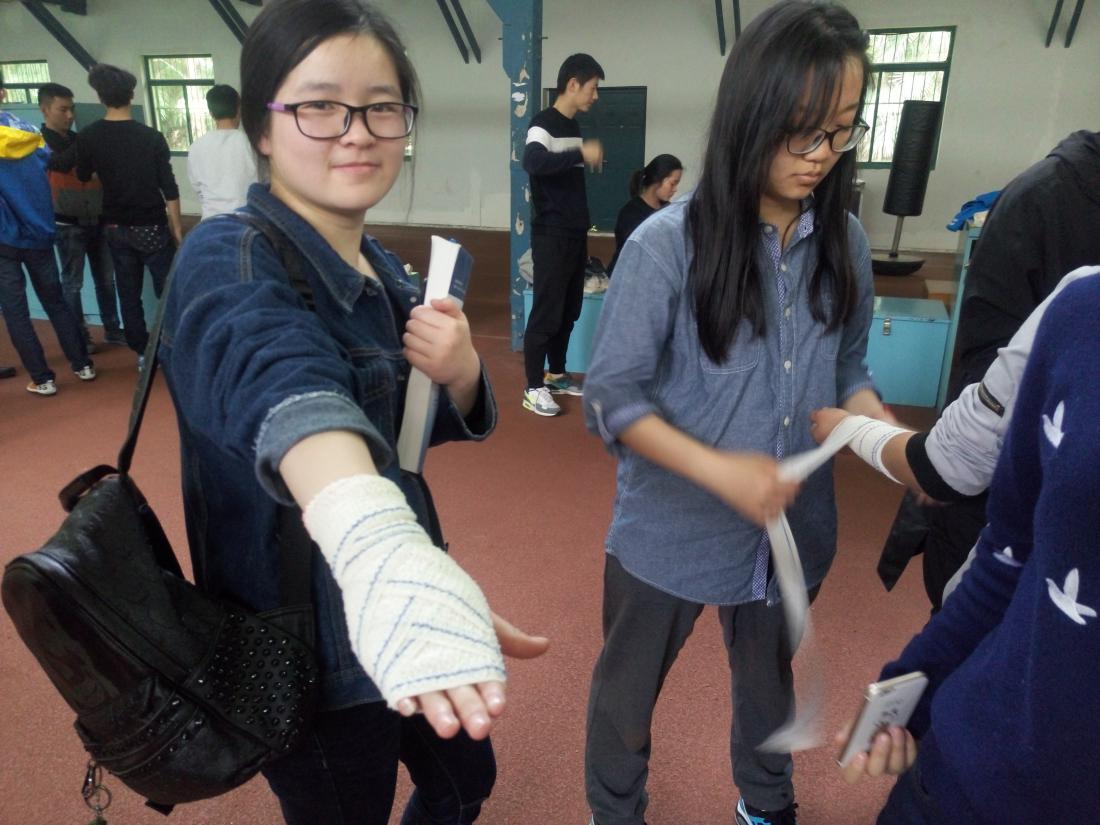 紧接着,马老师系统地向大家讲授了卷带的四种包扎方法及包扎时的注意事项,并现场与同学们互动。生动形象的教学,使大家在很短时间内就了解了卷带的包扎方法。虽然包扎动作不熟练导致结果不甚美观,但包扎练习让同学们对包扎技术产生了浓厚兴趣。