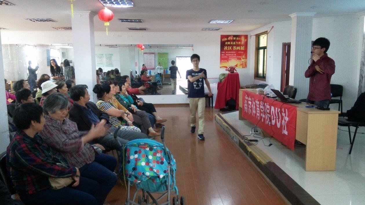 当日下午,在“DU”社指导老师、运动健康科学系团总支书记、辅导员喻菊老师和社长夏忆汝、副社长王宇笛带领下,社团成员早早到达会场,布置场地。经过前期的认真策划和有序分工,准备工作有条不紊。本次活动旨在以讲座的形式把“运动就是良医”的理念带到社区,为社区居民普及科学锻炼的知识。在社区居民们的热情包围下,会场座无虚席,现场气氛轻松欢快,不时互动。主讲王宇笛同学分别从运动的重要性、健身走的益处和健身走的形式等三个方面向大家做了详细介绍。居民们时而点头,时而低声交流,收获满满。讲座中,社团成员还向居民们展示了不同类型的健身走,并邀请大家参与其中,将会场气氛推向了高潮。活动最后,同学们向到场居民赠送水果,提醒大家运动后要及时补充维生素。
