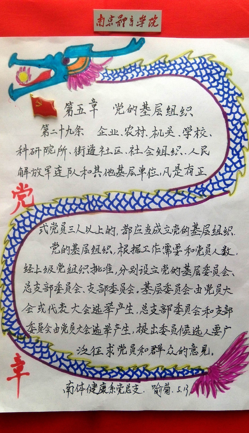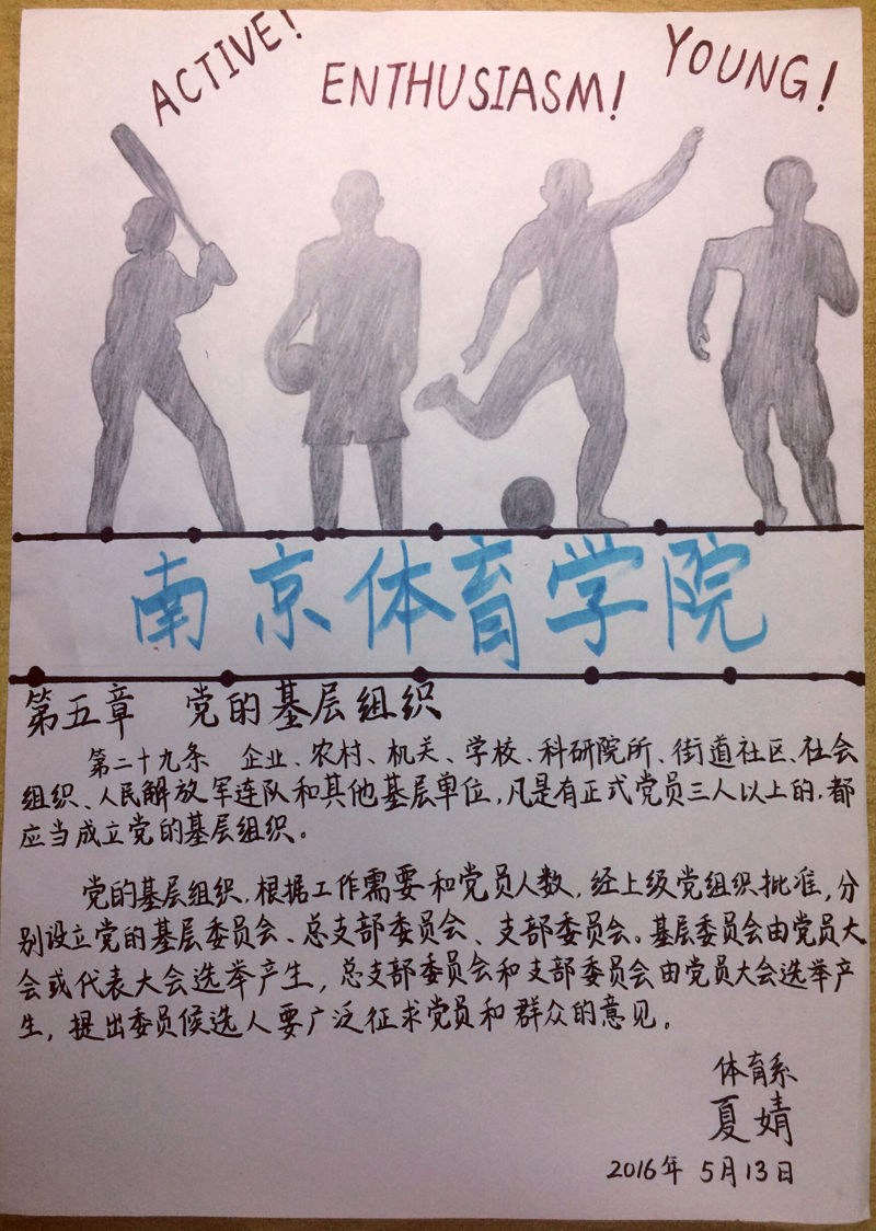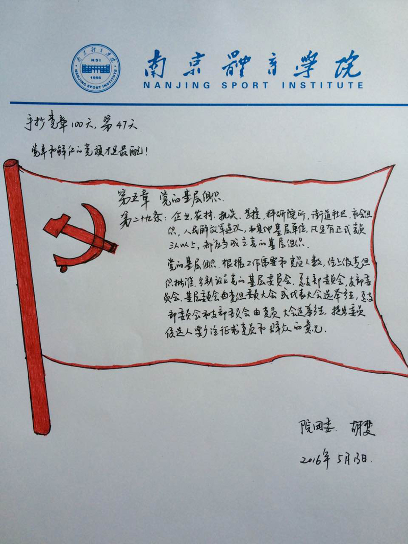 我院积极响应,于3月4日在全院范围内开展了“手抄党章100天”活动。广大师生(包括运动员、教练员)踊跃参与,大家抄党章,学党章,极大地增强了自己对党章的理解和对我党的热爱。3月和4月共有200多位师生提交手写作品2000余幅,其中不乏字迹优美、创意灵动的作品。大家不仅按要求保质保量完成了手抄党章作品,还制作了视频短片《PA视讯集团入口手抄党章100天》。
