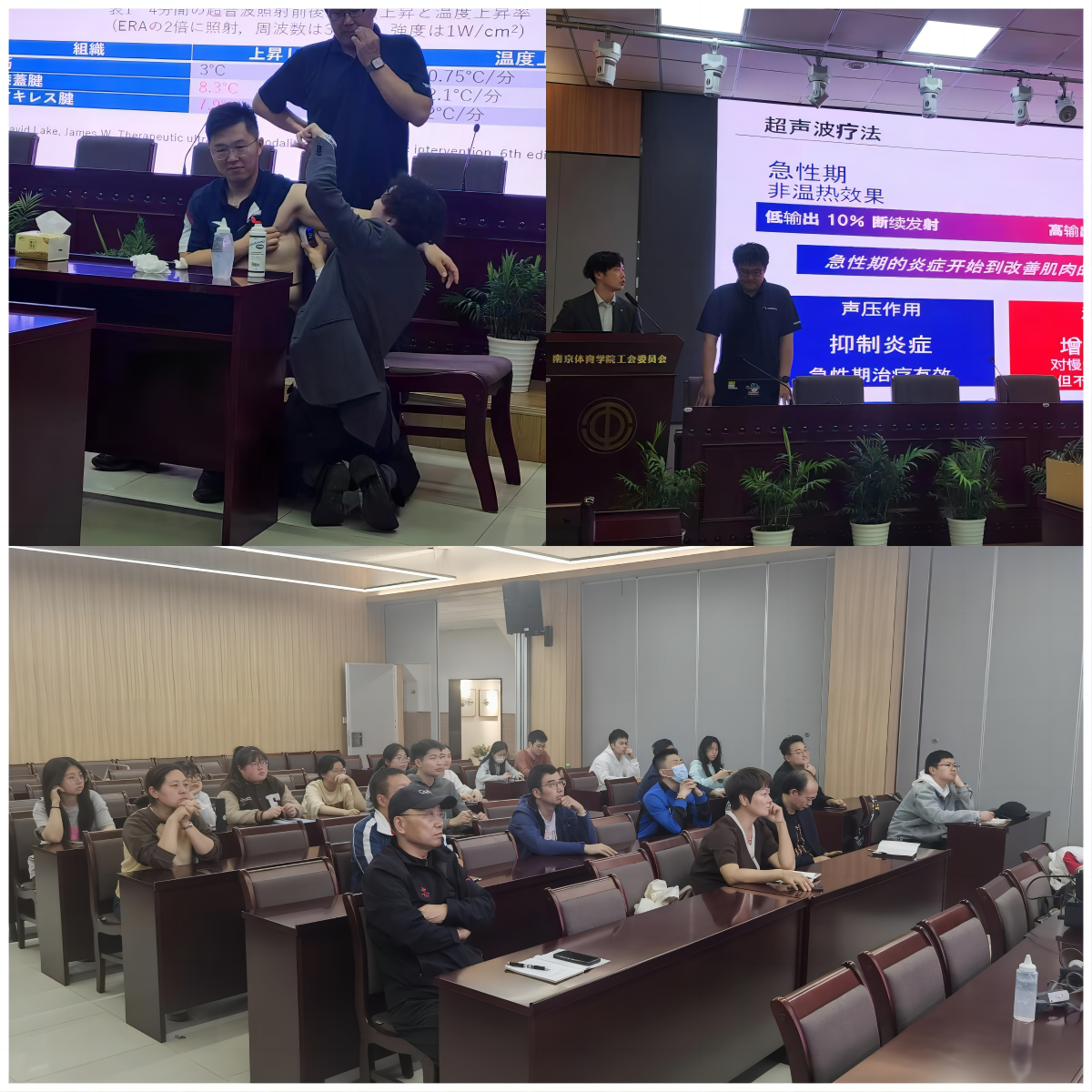 在研讨会上,队医小谷野悠汰首先介绍了超声波疗法的原理,重点阐述了超声波在运动损伤治疗中的应用,以及如何通过不同的治疗方式来避免高强度超声波产生的声压痛。随后,他还详细介绍了干扰电在运动员中的运用,分享了干扰电在改善肌肉状态等方面的研究成果。介绍最新的电疗仪器在改善肌肉状态、促进血液循环、减轻疼痛等方面的作用。PA视讯队医以及部分运动员也参与了现场体验,并就治疗效果和方式展开了讨论,积极分享各自的看法和体验。