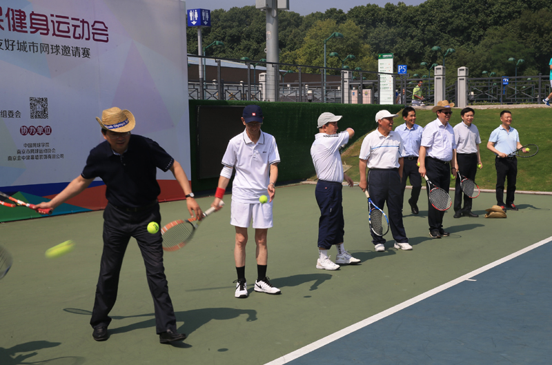 开幕式后,省第七届全民健身运动会网球大赛暨2016年友好城市网球邀请赛在我院中国网球学院开拍。 在简短的网球比赛开幕式上,原江苏省政协副主席胡序建、原南京军区联勤部部长吴继科、原解放军95基地司令员崔秉书、院党委书记陈国祥、院长杨国庆、中国网球学院院长蒋宏伟、省体育产业集团有限公司总经理陆路、中国银行江苏分行副行长关敏、省网球运动协会副会长、南京金中建幕墙装饰有限公司副董事长杨金平为比赛开球。