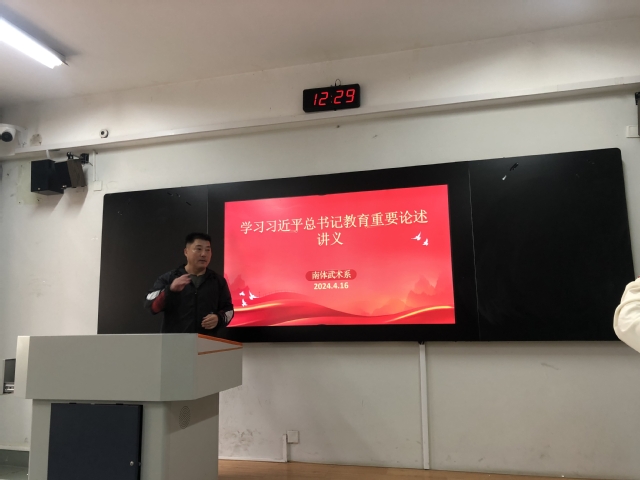 4月16日中午,武术系全体教师在教学楼1201教室举行了集体教研活动,学习了习近平总书记关于教育的重要论述。