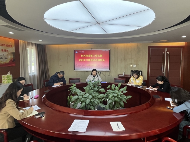 4月18日下午,机关党委第三党支部召开党纪学习教育动员部署会,传达学习校党委和机关党委党纪学习教育动员部署会精神并研究部署协同党委做好党纪学习教育工作。会议由党支部书记陈蕾主持。