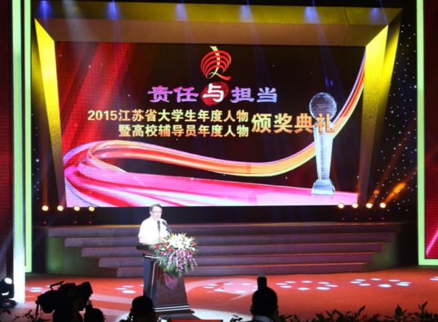 6月16日,由江苏省教育厅主办,南京大学承办的“2015江苏省大学生年度人物暨高校辅导员年度人物”颁奖盛典在南京大学仙林校区恩玲剧场隆重举行。来自全省各高校的数十名大学生年度人物和高校辅导员年度人物,以及获得提名奖和入围奖的各高校同学和老师都参加了此次盛典。省委教育工委书记、省教育厅厅长沈健及相关主管部门领导,省内部分高校分管学生工作的领导及学生工作部门负责人等专家作为嘉宾和评委出席了此次活动。来自省内各高校的数百多名师生代表也到场观摩。