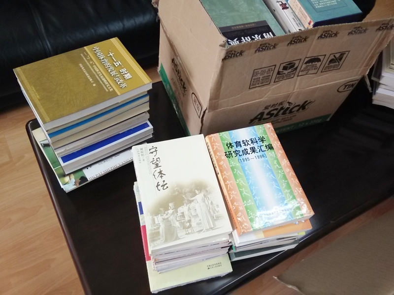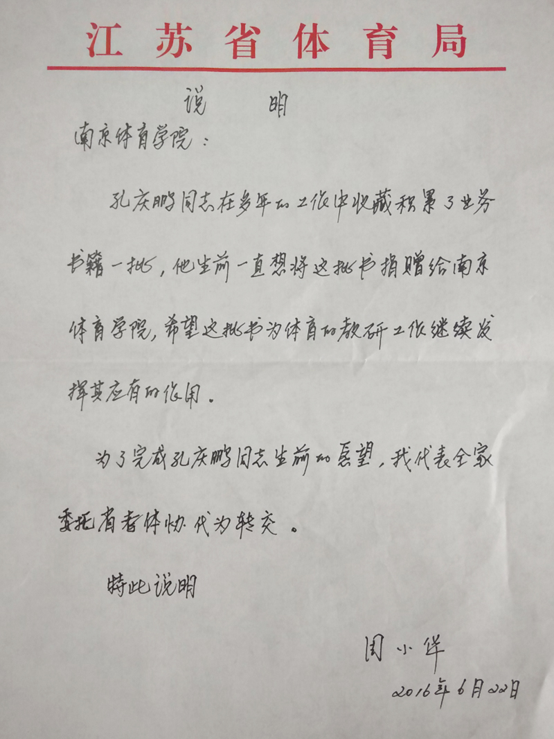 孔老在多年工作中收藏积累了一批业务书籍,一直想将这批书捐赠给我院,希望它们为体育教研工作继续发挥应有作用。孔老于今年6月因病去世后,其夫人周小华女士为完成孔老生前愿望,代表全家委托省老体协向我院代为转交了这批图书。
